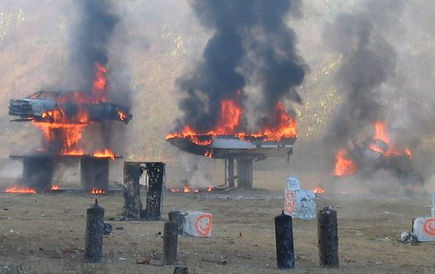 Machine gunners shoot at a wide variety of used appliances, abandoned vehicles, and barrels of fuel with pyrotechnic charges attached.